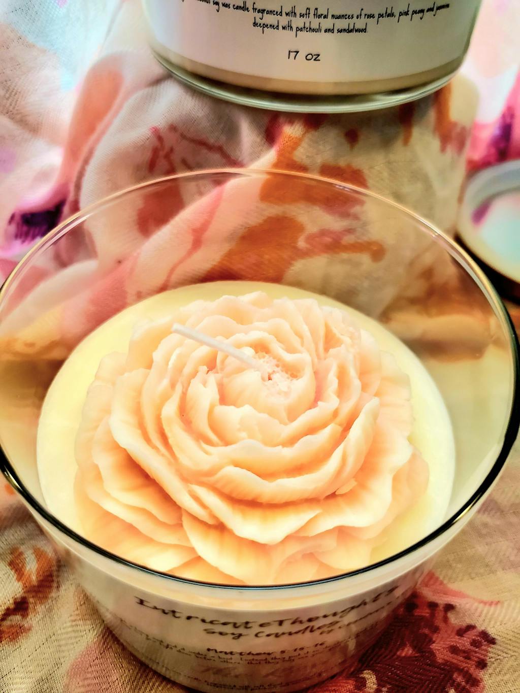 Our single wick candle is 24 oz and has sensual notes of sandalwood and rose. The top of the candle has a pink rose and comes with a rose gold lid.